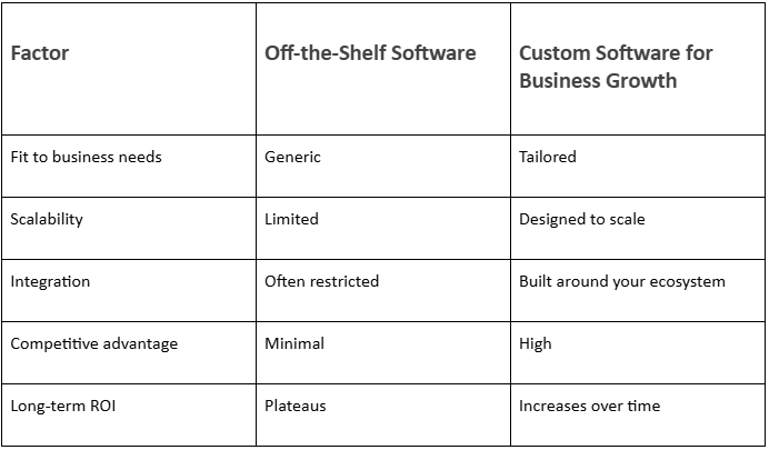 Off-the-shelf software works generally. It has limited scalability, restricted integrations, and delivers less competitive advantage. Over time, this causes ROI to flatten.