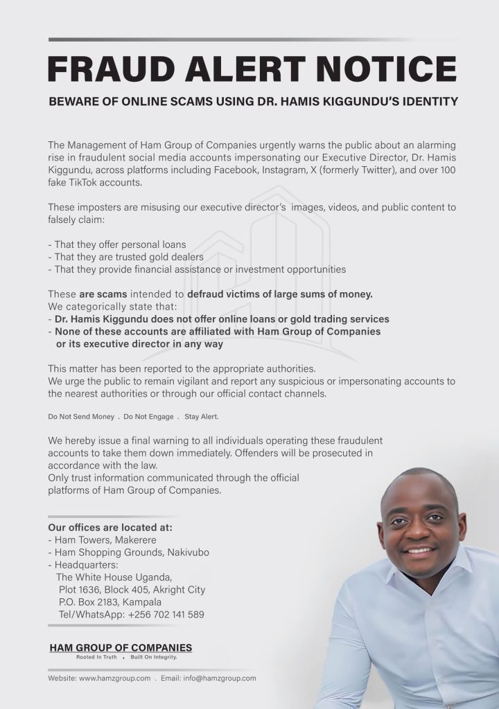 > “We wish to clearly state that Dr. Hamis Kiggundu and the Ham Group of Companies do not operate any loan, school fees, or youth empowerment programs. Anyone making such claims is a fraudster. The public should always verify information through our official communication channels,” Sserugo emphasized.